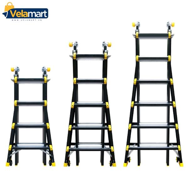 Chiều cao thang khi sử dụng ở dạng chữ A có thể điều chỉnh tối thiểu 1.86m và tối đa 3.55m, phù hợp cho hầu hết các công việc trong gia đình cũng như các ngành nghề kỹ thuật như điện, lắp đặt truyền hình, bảo trì… thường xuyên phải làm việc ở nhiều độ cao khác nhau. Lưu ý: Model này không sử dụng được ở dạng chữ I.