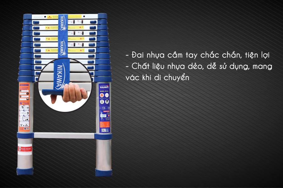Thang nhôm NIKAWA NK-60 được cải tiến có đai nhựa cùng loại, nhôm của thang dày hơn và chân đế cao su chống trượt.